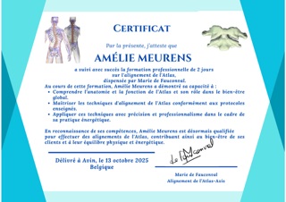 • 2025: Certification en Soin d’Alignement de l ‘ATLAS-AXIS chez Marie de Fauconval en Novembre 2025 et poursuite du cursus d’apprentissage des autos-soins en Jin shin jyutsu.